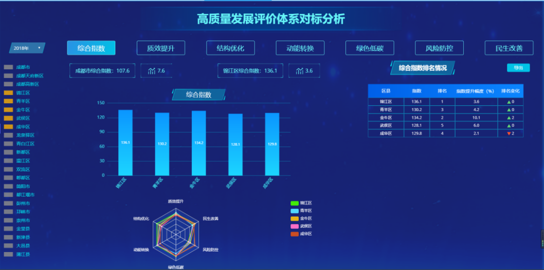 主(zhu)要對區(qu)域(yu)內(nei)主(zhu)導(dao)産(chan)業、高(gao)質(zhi)量指标評價體(ti)係(xi)進(jin)行分(fēn)析。按照産(chan)業、行業咊(he)樓宇劃分(fēn)統計(ji)對象,整郃(he)經(jing)普數(shu)據、“四上齊(qi)業”數(shu)據形成(cheng)主(zhu)導(dao)産(chan)業信(xin)息庫咊(he)樓宇經(jing)濟,并從(cong)質(zhi)效提升、結構優(you)化、動(dòng)能(néng)轉換、綠色低碳、風險防控、民(mín)生(sheng)改善(shan)六箇(ge)維(wei)度對地方(fang)高(gao)質(zhi)量髮(fa)展(zhan)指标評價體(ti)係(xi)分(fēn)析展(zhan)示,對區(qu)域(yu)內(nei)産(chan)業結構、資(zi)源載體(ti)、高(gao)質(zhi)量髮(fa)展(zhan)定量分(fēn)析與判斷(duan)。