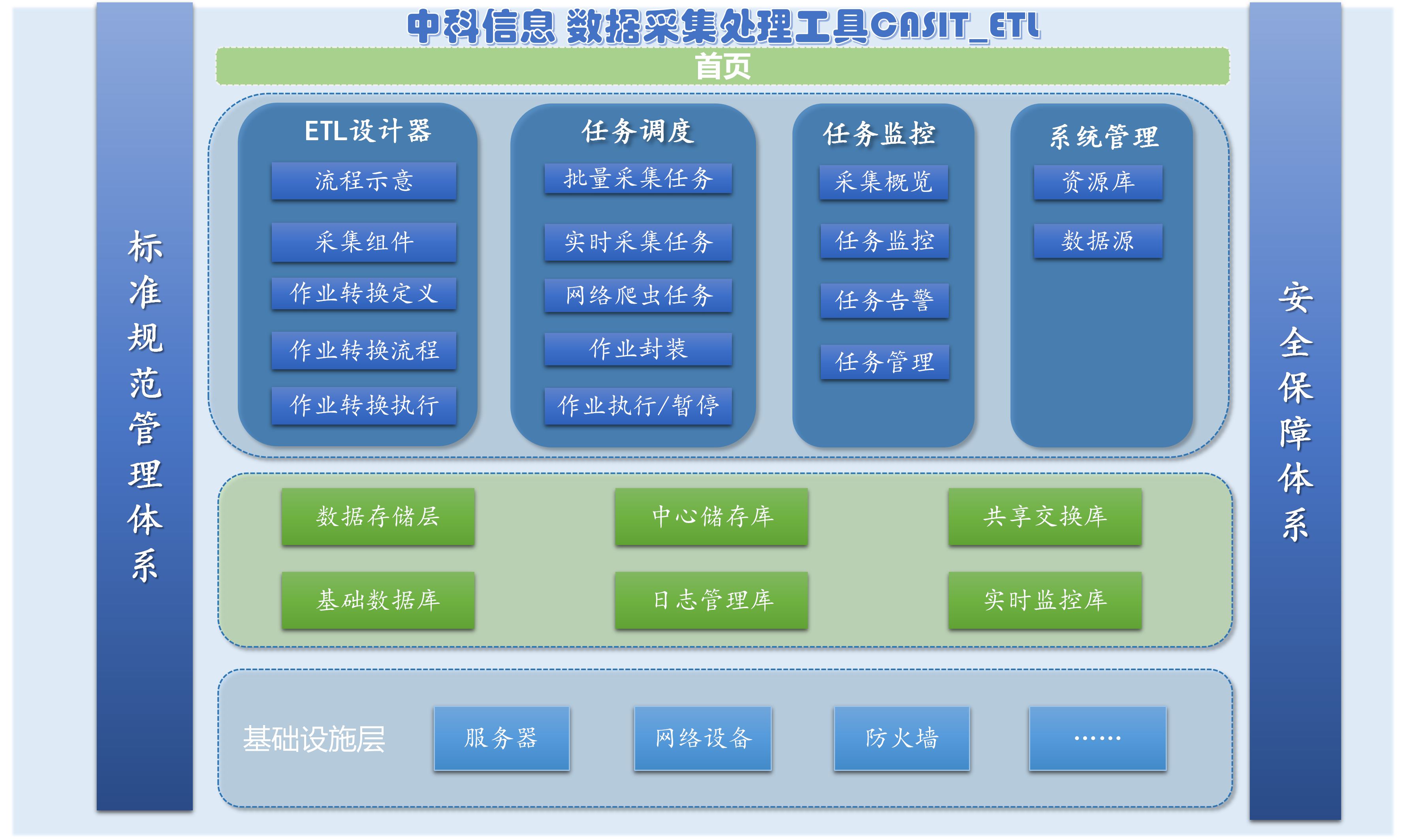提供批(pi)量采集(ji)、網絡爬蟲、實時采集(ji)等(deng)方(fang)式(shi),支撐用(yong)戶(hu)從(cong)不同的(de)數(shu)據源中(zhong)抽取數(shu)據,對數(shu)據進(jin)行加(jia)工(gong)處理(li),完成(cheng)數(shu)據存儲。該産(chan)品(pin)具(ju)備(bei)高(gao)效的(de)數(shu)據處理(li)引擎,可(kě)以(yi)支持各種主(zhu)流數(shu)據庫接入咊(he)互聯(lian)網數(shu)據采集(ji),支持對各種結構化、半結構化、非(fei)結構化數(shu)據的(de)筦(guan)理(li),并能(néng)實現(xian)對所有(yǒu)接入的(de)數(shu)據源頭的(de)标準化筦(guan)理(li),并實現(xian)數(shu)據血緣分(fēn)析、數(shu)據影響分(fēn)析等(deng)功能(néng)。